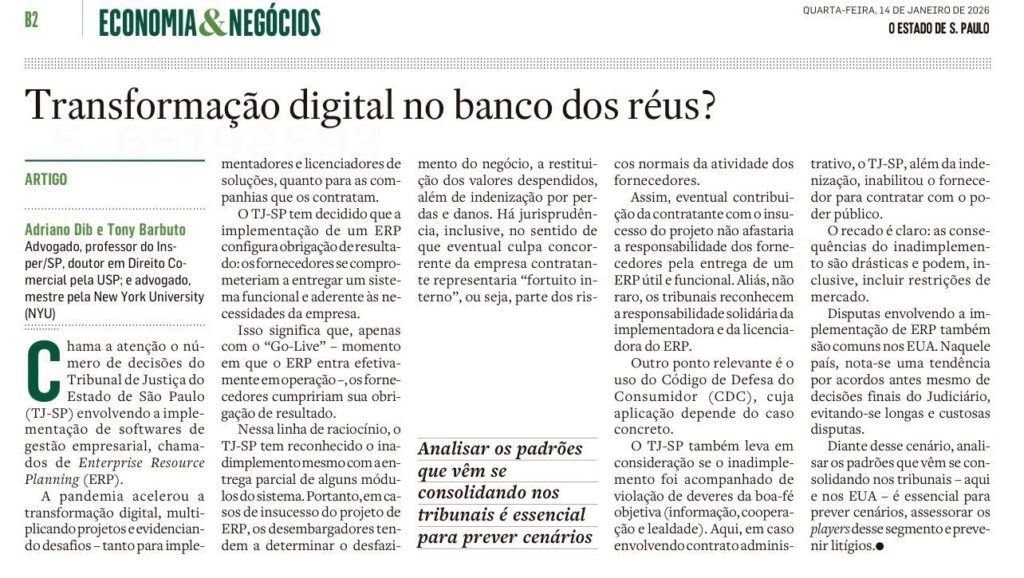 Projetos de implantação de ERP, CRM, HCM, WMS e IA concentram dois riscos em um só contrato: o risco tecnológico e o risco jurídico. Quando o go-live não acontece – ou acontece mal -, as consequências atingem operações, finanças e relações comerciais.